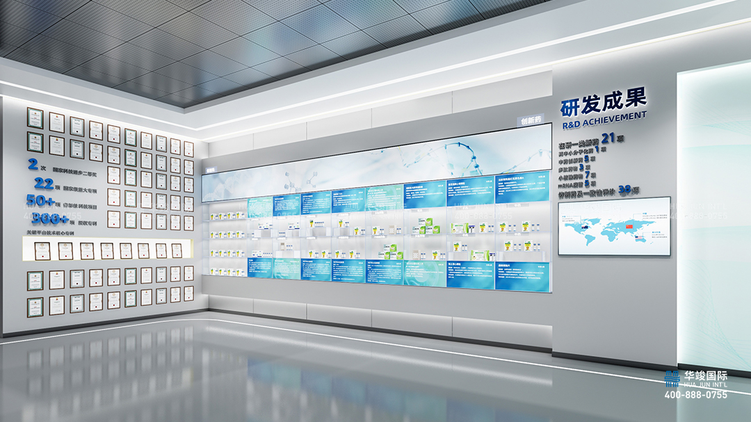 藥企的重中之重是新藥研發(fā)和核心技術(shù)。在研發(fā)成果展區(qū),陳列悅康藥業(yè)現(xiàn)有的創(chuàng)新藥和仿制藥,聚光燈打在產(chǎn)品上,在光影流動(dòng)間,專注每一種守護(hù)人類健康的藥品。通過(guò)疏密有致的專利墻,定格悅康藥業(yè)的每個(gè)榮耀時(shí)刻。